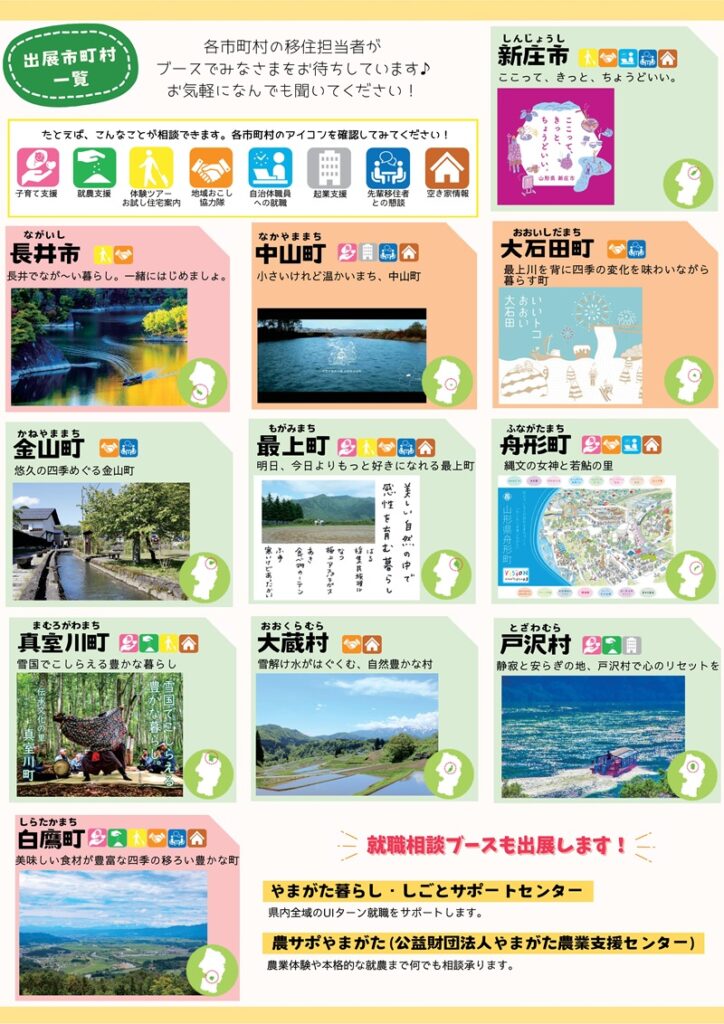 「やまがた暮らしやま盛り相談DAY」は、山形県内から複数の市町村が集合する、山形での生活に必須の情報が盛りだくさんの移住相談会です。
